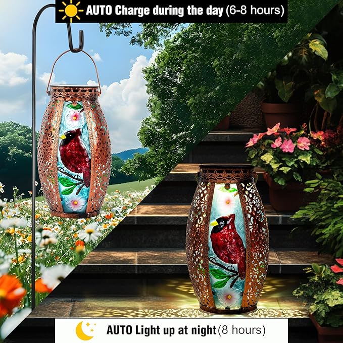 - 【Decortaion Lantern & Garden Gift】This solar lantern can be hung anywhere in your outdoor garden, yard, patio, porch or place on tabletop. cardinal decor and warm lighting make this lantern an ideal patio decorations outdoor.