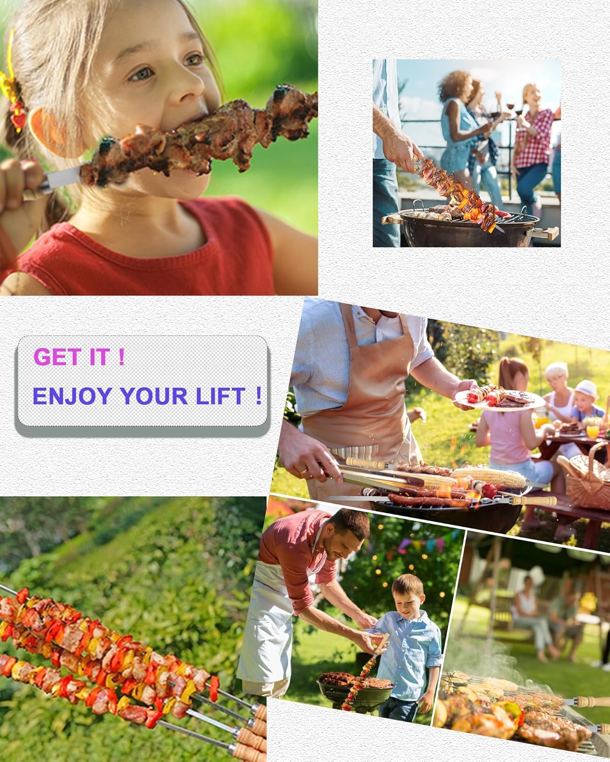 - 【PRECAUTIONS】1、Children should be supervised by adults when they are used. Stainless steel skewers are very sharp. 2、After useing, just let these grilling skewers sit in warm water, hand wash with gentle detergent or threw them in dishwasher, wipe away water and keep in dry place, and they'll come out as new. It is recommended to store the barbecue stick in a cool, dry and ventilated place. 3、 We manufacturing products attentively,The BBQ skewers are large, please buy it carefully.