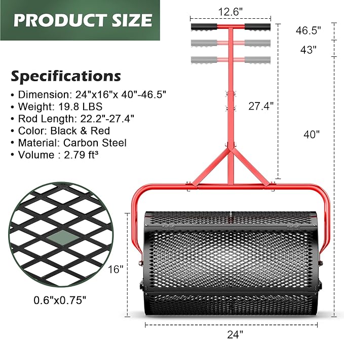 - [Adjustable Non-Slip T-handle] Equipped with an adjustable non-slip T-handle, the compost roller provides comfort and ease of use even during extended periods of spreading. This ergonomic handle is designed to reduce fatigue and increase control for users of all statures.