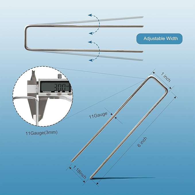 - 【LANDSCAPE STAPLES PACK】100 pack U-shaped lawn stakes with beveled ending are 11 gauge, 6 inches length, 1 inch adjustable width