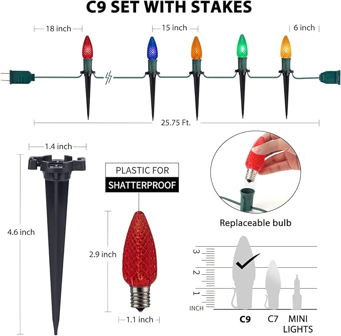 - Hanging or Ground Plugging: Hang up this C9 Christmas stakes lights around your roof line to outline entire house will be amazing, or plug the C9 Christmas lights with stakes alongside the walkway or lane in lawn or garden; These waterproof Christmas outdoor decorations lights for the yard comply with the rain test of UL certification and wonderful decorations for home, patio, garden
