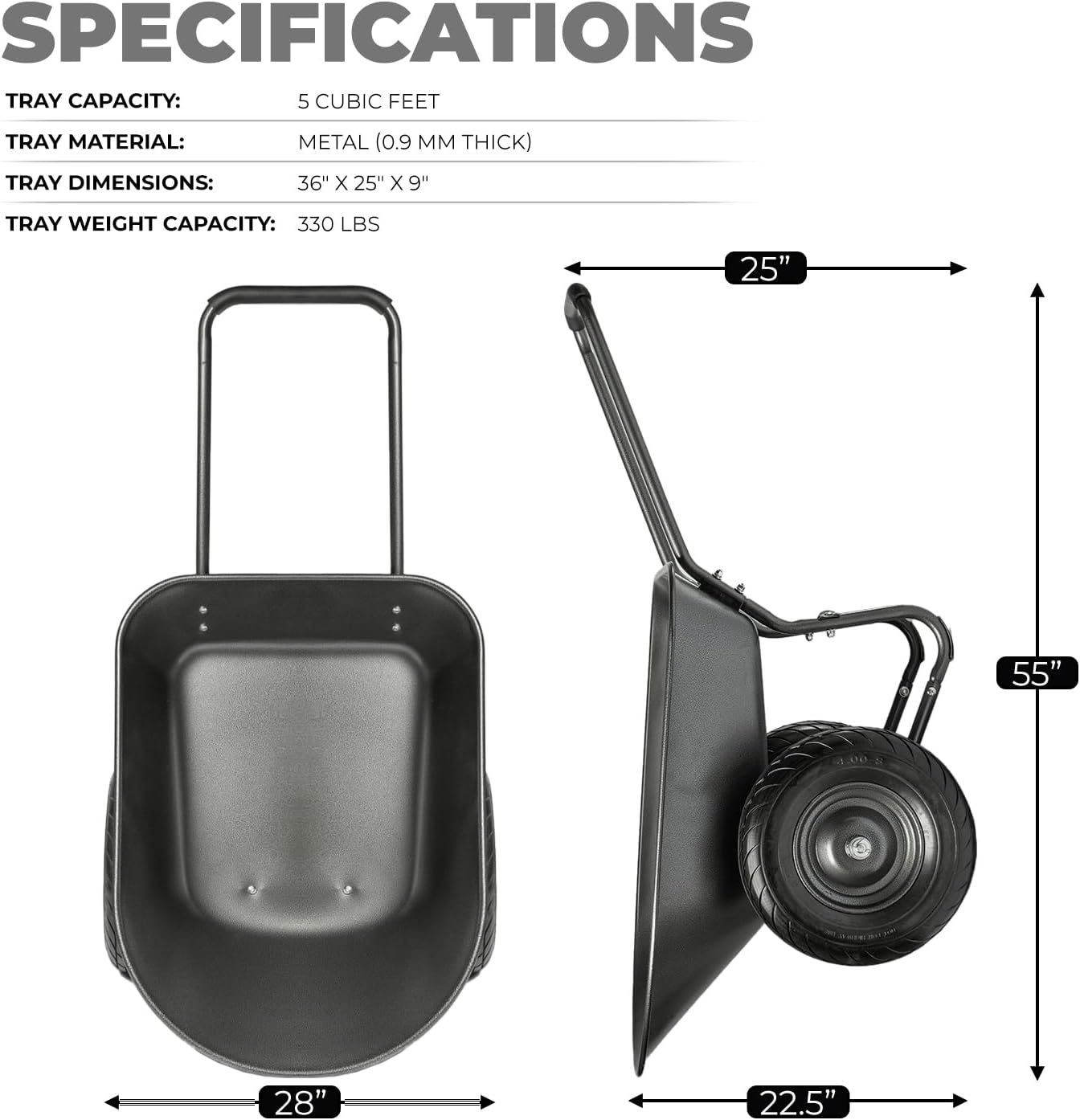 - Multipurpose Garden Cart - Deep wheelbarrow holds up to 5 cubic feet of soil, bricks, mulch, gravel, & more, so you can conveniently carry out landscaping and other home improvement projects