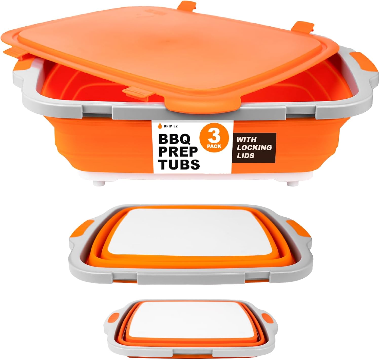 Drip EZ Collapsible BBQ Prep Tubs 3-Piece Set- For Meal Prep Marinating Food Storage - Includes Cutting Board & Lid - (1) JR + (1) OG + (1) XL - Orange