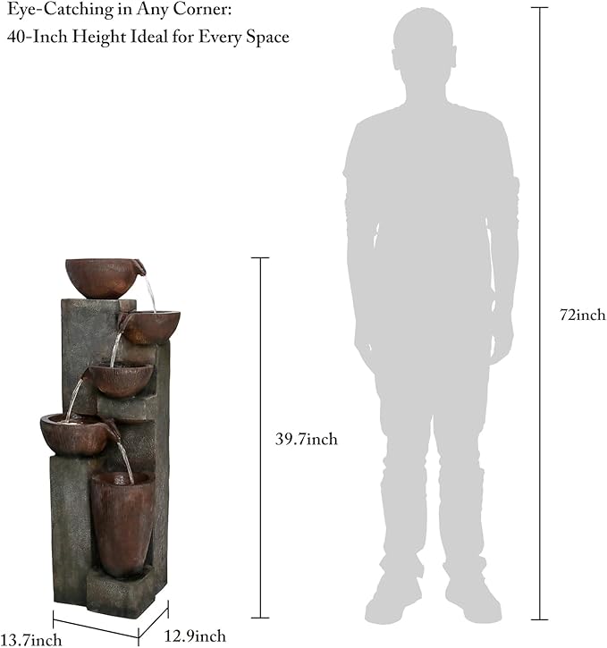 - Ideal Decor Size - (L*W*H)13.7”x12.9”x39.7” -Hopes to provide you with the most perfect and ideal house, office, garden decoration. The 5-tiered natural looking resin stone fountain was designed with very suitable size for your any indoor outdoor setting, including door entrance, staircase entrance, living room, office room, corridor, garden, patio, backyard,etc.