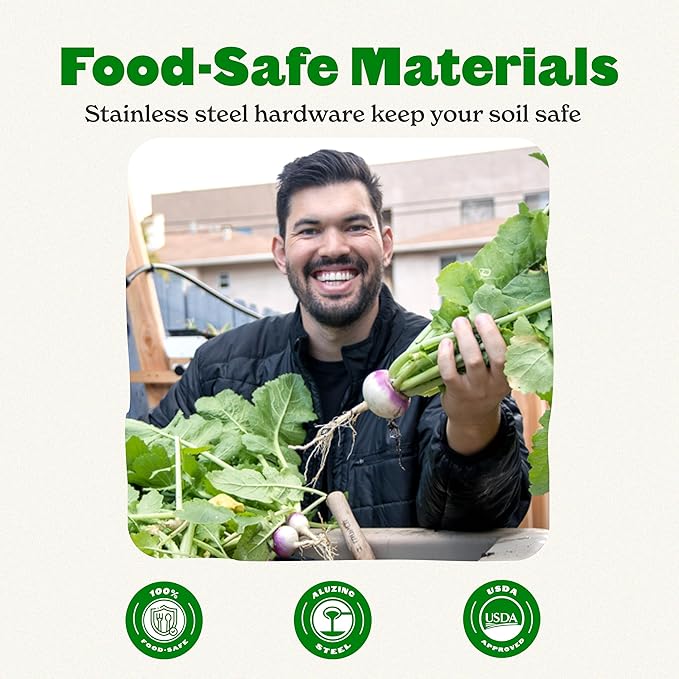 - Food-Safe and Eco-Friendly Materials Crafted with 100% food-safe aluzinc steel and stainless steel hardware, our planters keep your soil chemical-free for worry-free growing. Made using sustainable practices and recycled materials, our raised beds are perfect for eco-conscious gardeners.