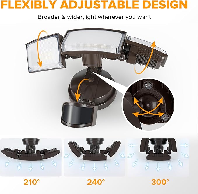 - METAL AND ROTATABLE DESIGN: Adjustable heads provide a customizable coverage area. Aluminum material, IP65 waterproof and 50,000hrs lifespan, make this security light pecfect for the porch, back yard, front door, garage, driveway, walkway, step, etc.
