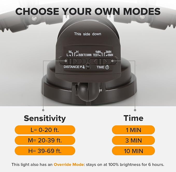 - 4 LIGHTING MODES: Test Mode, Security Mode, Dusk to Dawn Mode and Manual Override Mode. Manual override mode allows light to operate constantly for selected period of time. Deactivates during daylight hours. More choices can meet different demands for each customer. Choose the most appropriate mode for your needs.