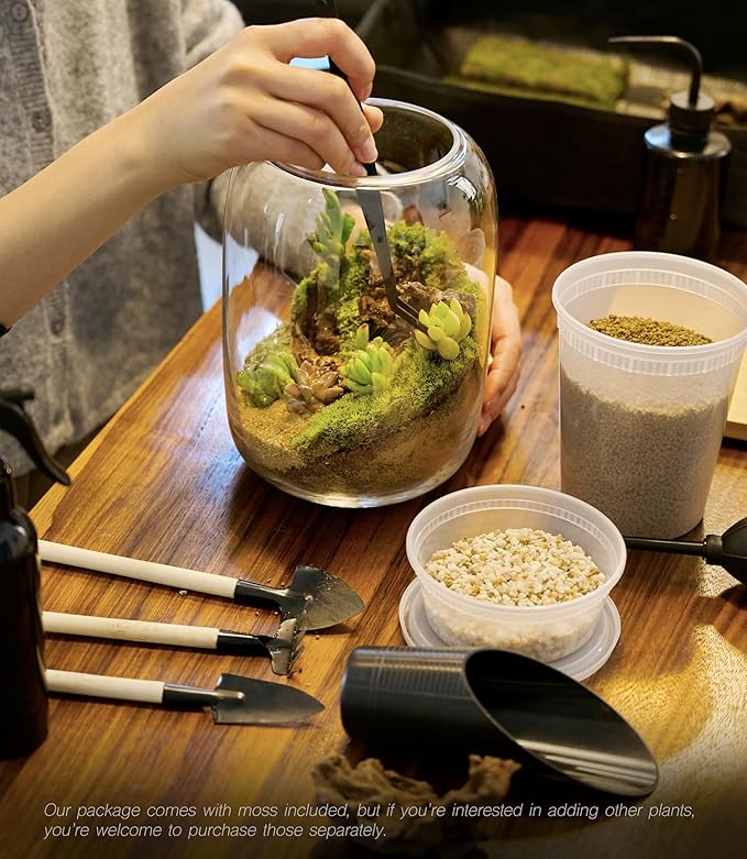 - Included Components : terrarium jar, potting soil, garden gravel, clear sand, live moss, plant mat, 2 shovels, rake, spray bottle, scoop, stainless steel tweezers, brush, 4 pieces of driftwood, 6 landscape stones, 2 decorative ornaments, grow light terrarium jar, potting soil, garden gravel, clear sand, live moss, plant mat, 2 shovels, rake, spray bottle, scoop, stainless steel tweezers, brush, 4โฆ See more