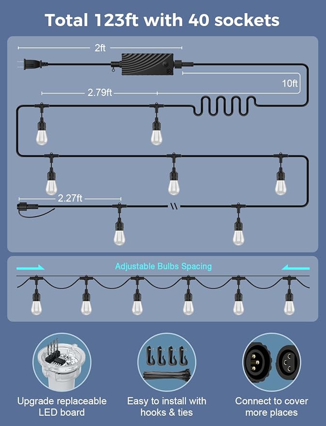 - Hassle-free Group Control: Manage multiple sets of led patio string lights as a single unit to sync the same series of lights across locations with one touch; and you can also easily control the same set of string lights with your family or friends