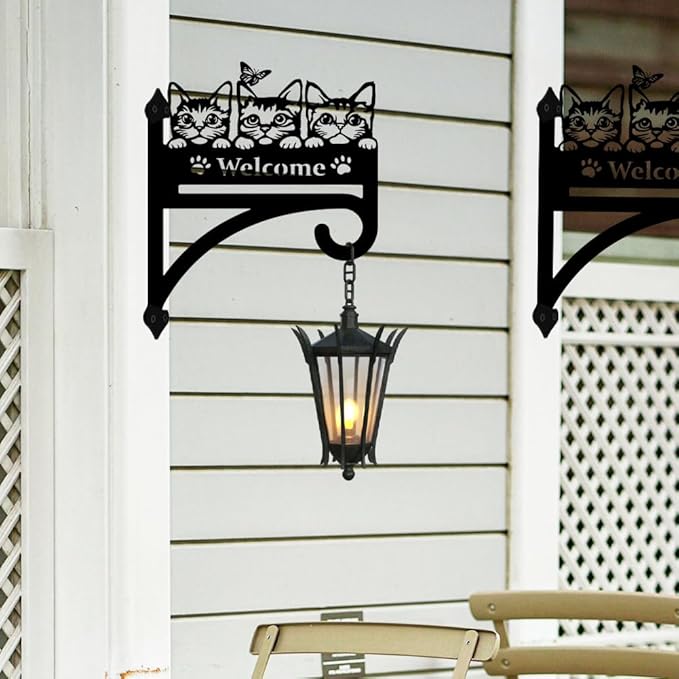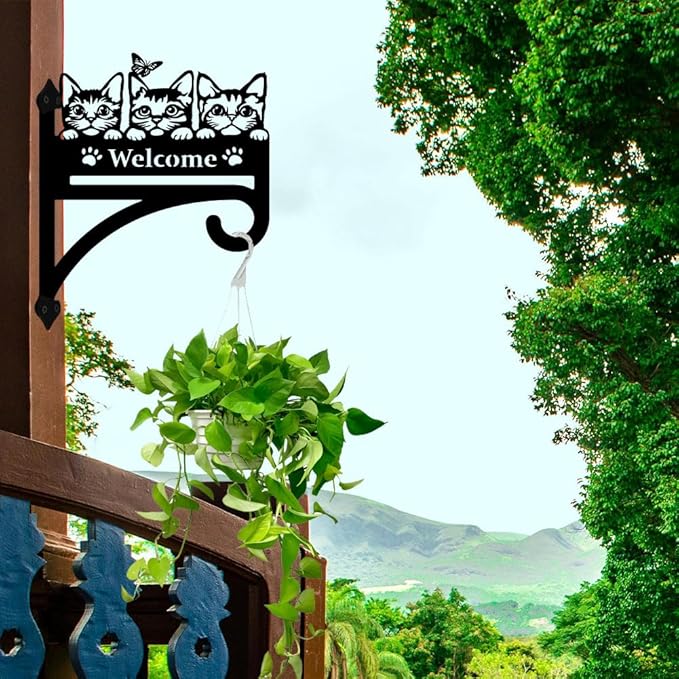 peacoblue Iron Plant Hangers Hooks Cat with Welcome for Outdoor Indoor Hanging Plants Flower Fern Pots Lantern Bird Feeder, 12"x15" Weather Resistant Metal Wall Holder for Porch Garden Farmhouse
