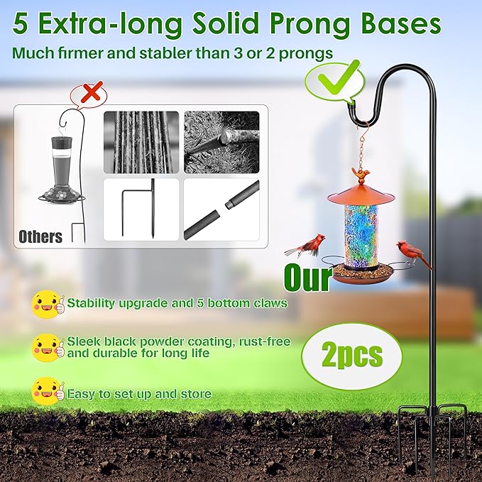 XDW-GIFTS Bird Feeder Pole for Outdoor, 2-Pack 92 Inch Shepherds Hooks Heavy Duty Garden Pole for Hanging Plant Basket, Solar Light Lanterns, Garden Plant Hanger Stands with 5 Base Prongs