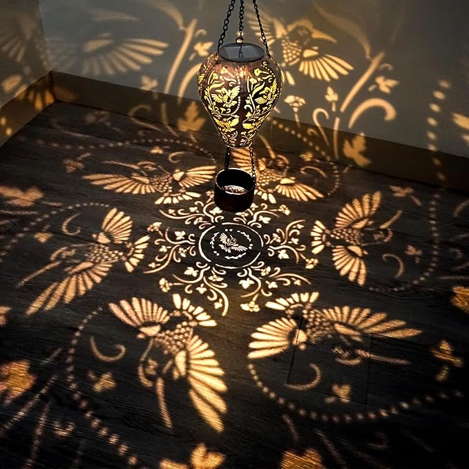 - 【Hummingbird Pattern】The Profinella hot air balloon solar lantern features a unique metal hummingbird cut-out pattern design. During the day, it serves as an art ornament to enhance your garden, yard or outdoor space; at night, it transforms into a magical light show, projecting clear hummingbird patterns onto the ground or walls, adding endless charm to your outdoor decor.