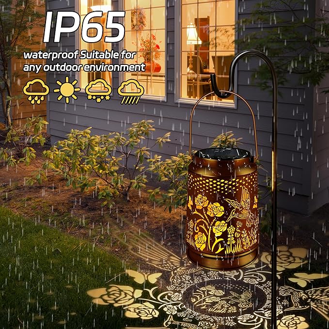 - [Enchanting Vintage Design] Antique bronze hummingbird solar lantern features laser-cut rose hummingbird & butterfly motifs, casting mesmerizing shadow patterns when illuminated. The retro copper finish blends Victorian elegance with modern solar tech, perfect for garden/patio ambiance.