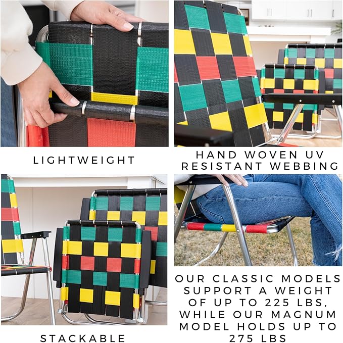 - Handmade In The USA: Our chair features hand-woven straps with a mechanical stitch for superior durability and an authentic handmade feel. Made with a sturdy aluminum frame, copolymer arms, and polypropylene webbing, ensuring long-lasting use and reliability