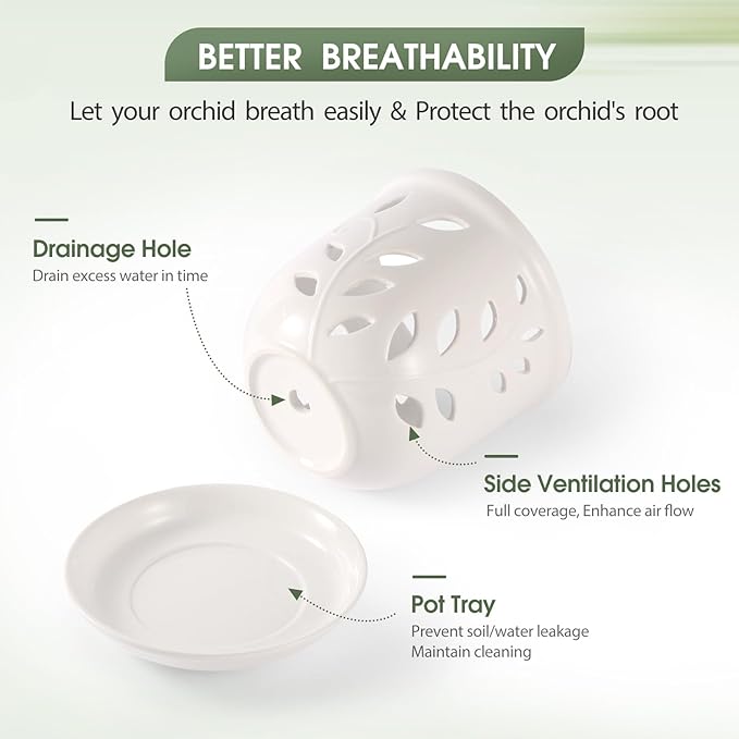 - Optimal Airflow Design: This orchid pot with holes features strategically placed side ventilation holes to promote air circulation, ensuring plants thrive and flourish. The bottom drainage holes effectively remove excess moisture, maintaining an ideal root environment for healthy growth. Each orchid pot comes with a matching water tray for a clean and tidy setup