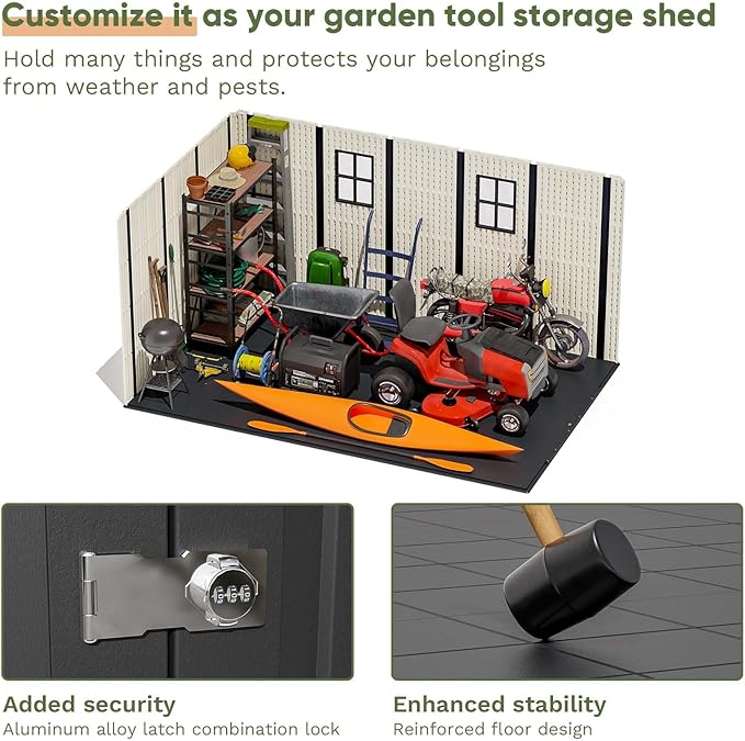 - Plastic Floor Base Provides High Stability: The plastic floor base is sturdy and reliable, providing a safe place to store all of your outdoor tools and equipment. It adds an extra layer of protection against water damage and moisture, ensuring that your belongings remain safe and dry.