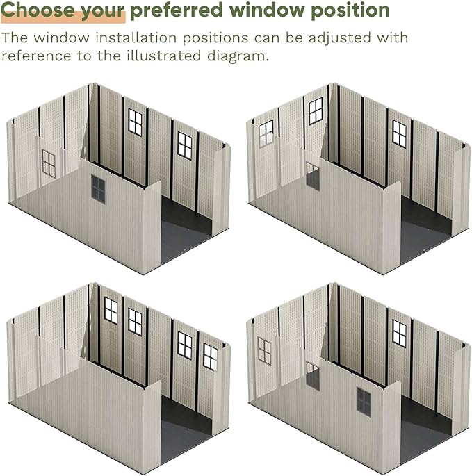 - Window design: Two window designs lets in natural light, reducing the need for extra lighting๏ผProvides a pleasant view๏ผOffers added security with a view of the shed's contents. And the position of the window can be adjusted according to your needs with the wall panel.