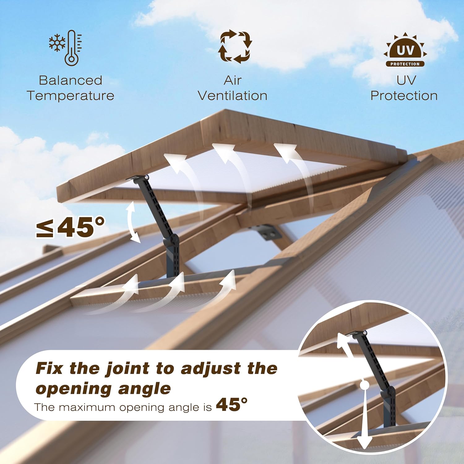 - Adjustable Roof: Our wooden outdoor greenhouse is designed with adjustable roof which is fixed with the joint to adjust the opening angle. You can adjust the angle to meet you need, and the maximum opening angle is 45 degree. Adjustable roof design provides UV protection while ensuring temperature balance and air circulation