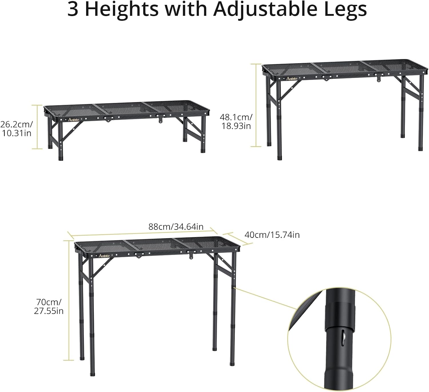 - 3 Height Adjustable up to 27.5 in: The height of Anbte folding table is adjustable between 10 in, 20 in and 27.5 in.You can adjust the height of the table according to the suitable for different occasions: picnic / bbq / beach / coffee / camping / fishing etc