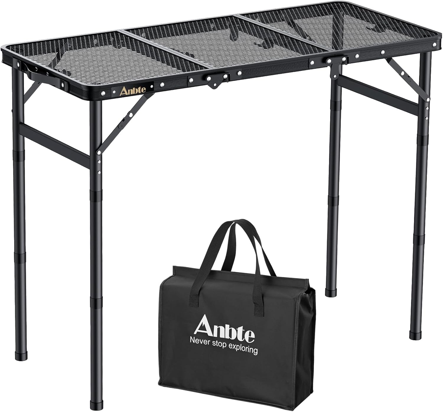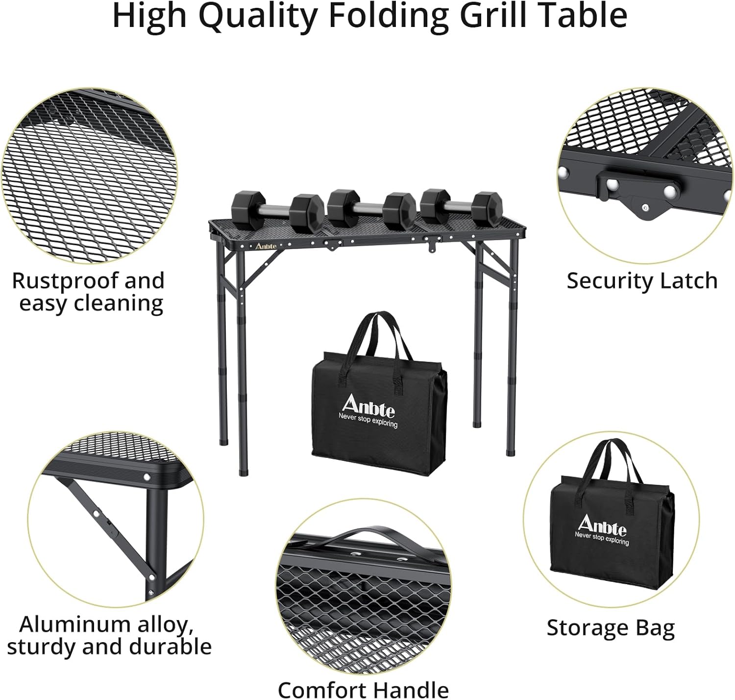 - Premium Quality Material, Stable and Sturdy: Anbte outdoor grill table is made of updated and thickened aluminum frame, very durable. Side snaps secure the tabletop in place and keep it level. U-shaped frame improves the stability of the table