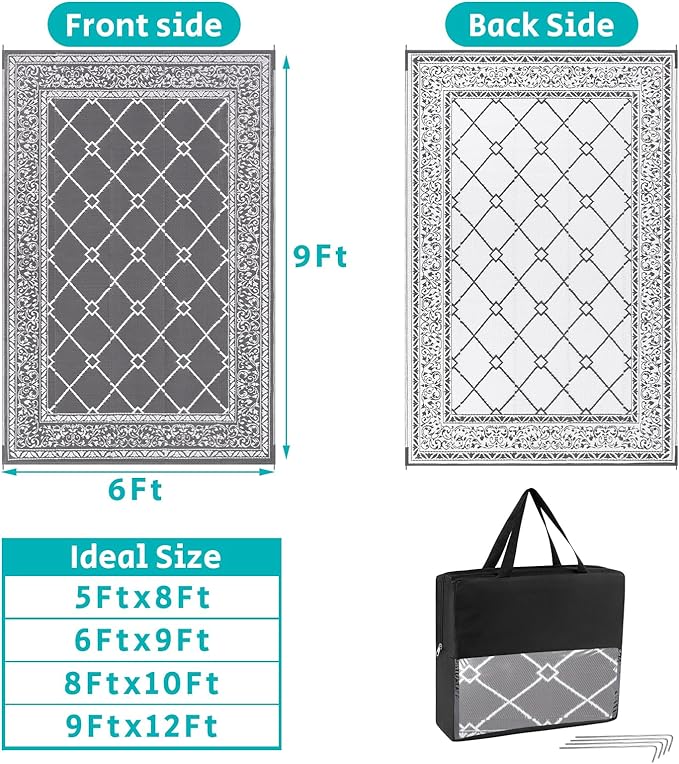 - Versatile Outdoor Carpet: The indoor outdoor plastic rugs have multiple choice in different colors(4'x6',5'x8',6'x9',8'x10',9'x12',9'x18',8'round), is ideal for a variety of indoor outdoor activities,like patio mat, deck rug, garden rug, beach mat, picnic mat, BBQ party mat, rv camping rug,pool rug,outdoor doormat,garage rug,front door mat,allowing you to have plenty of imaginable space for more fun.