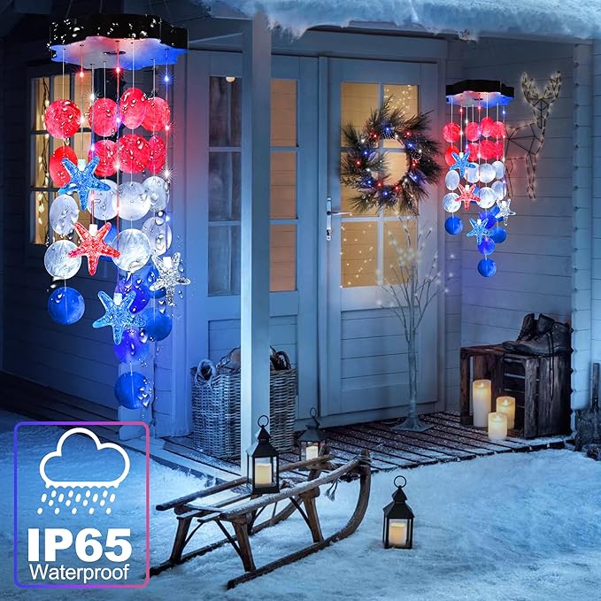 - 🎐Waterproof Solar Lights for Outdoor Decor: With IP65 waterproof and unique rain-proof and moisture-proof design, the solar outdoor lights can be hung indoors and outdoors as a lovely day and night decoration. You can enjoy the sight of the Red White Blue shell in the daytime and glowing shell at night.