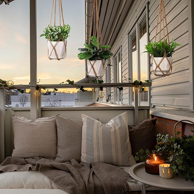- 【EASY TO HANG IN ANY SPACE】The hangers are suitable for indoor and outdoor use. Just expand the 4 leg strings, put the plant pot in the middle of the conjunction. It is great for boho home decor, make your life become unique. Hanging plant holder can be used for living room, kitchen, hall, patio, high and low ceiling.
