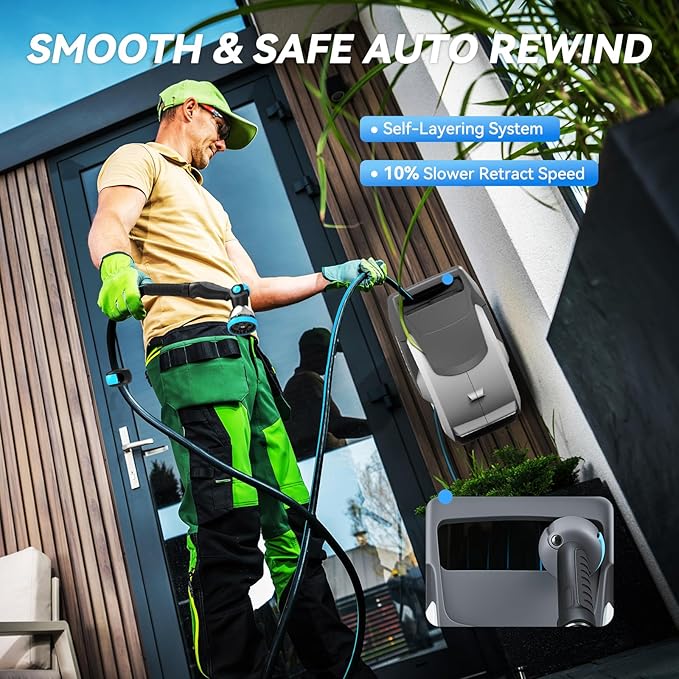 - Breezy Retraction, Automatically Tidy: No matter how far the hose is stretched, it can be retracted safely and slowly after a slight pull. Besides, the upgraded guide of the self-winding hose reel ensures a kink and tangle-free retraction, every time