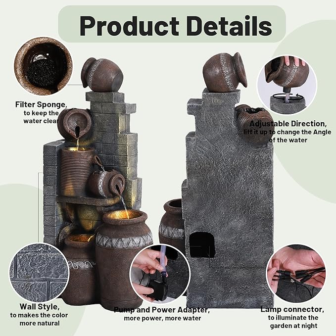 - Indoor/Outdoor Dual-Purpose: This garden fountain is using faux wall design, special striped bowls to make the waterfall fountain better blending seamlessly with garden, in the outdoor decoration can also be placed in the Entryway, Lobby, Office