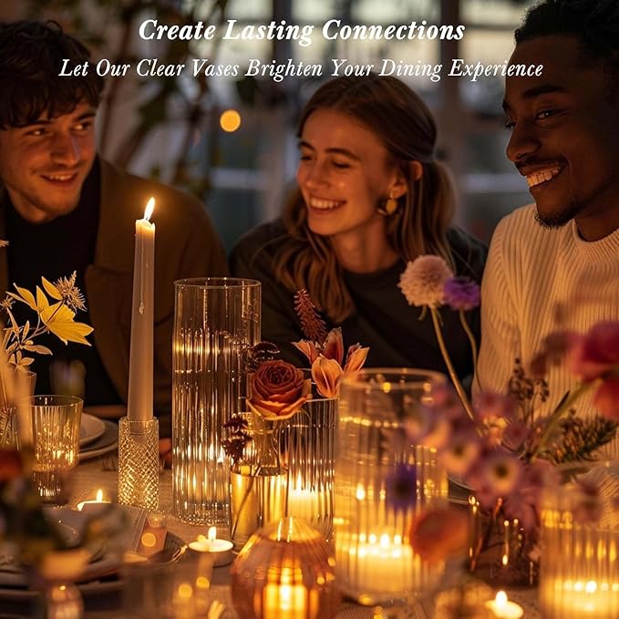 - 🌷【SIMPLE AND ELEGANT DESIGN】: The 12-pack 6-inch tall clear straight borosilicate glass vase features straight, textured surface that reveals unparalleled purity of beauty