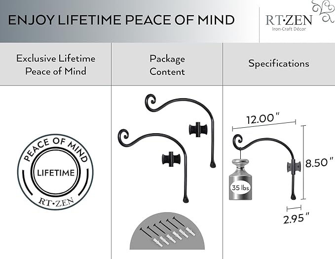 RTZEN Plant Hangers Outdoor or Indoor - Wrought Iron Metal Hanger Indoor Hook - Heavy Duty Wall Bracket Hooks for Hanging Plants Baskets Lanterns Wind Chimes - 2 Pack (Black Axe-Shape Hooks)