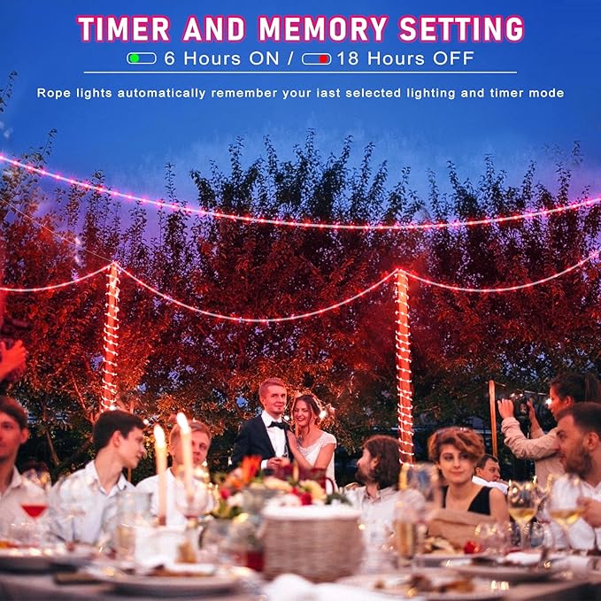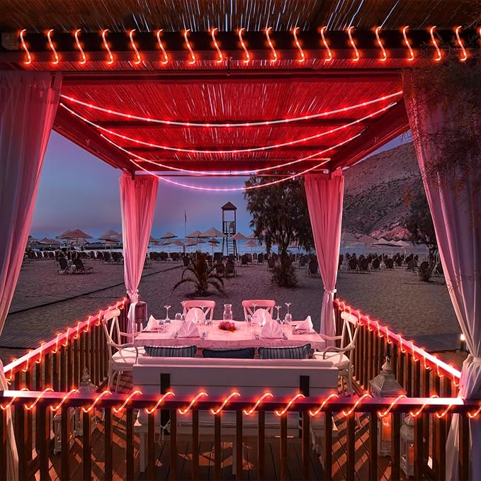 - 【Waterproof Outdoor String Lights】- IP65 Waterproof design, they are suitable for all weather use, remaining bright and sparkling even during strong rain and windy days. The outdoor rope lights is ideal for year-round outdoor decor and can illuminate gazebos, canopy, corridors, gardens, and patios. But please note the plug is not waterproof.