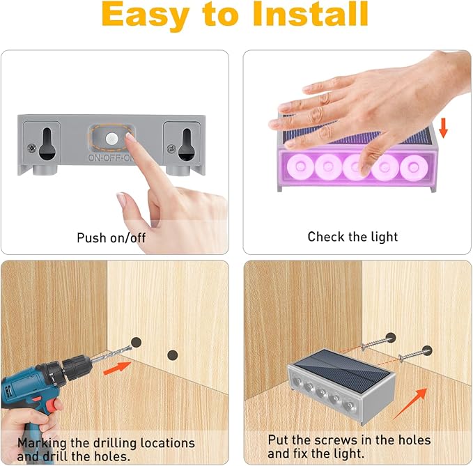 - 【Easy to Install】T-SUN solar powered step lights outdoor waterproof can be quickly installed in any outdoor step where it can absorb the sun light directly,no wiring required. Outdoor waterproof step lights are widely used for step, stairs, deck steps, courtyard, balcony, guardrail, patioetc, also a fantastic option for festive decorative lighting occasions . You can fix it with screws or expansion plugs, 2 screws and 2 expansion plugs is included in the package.