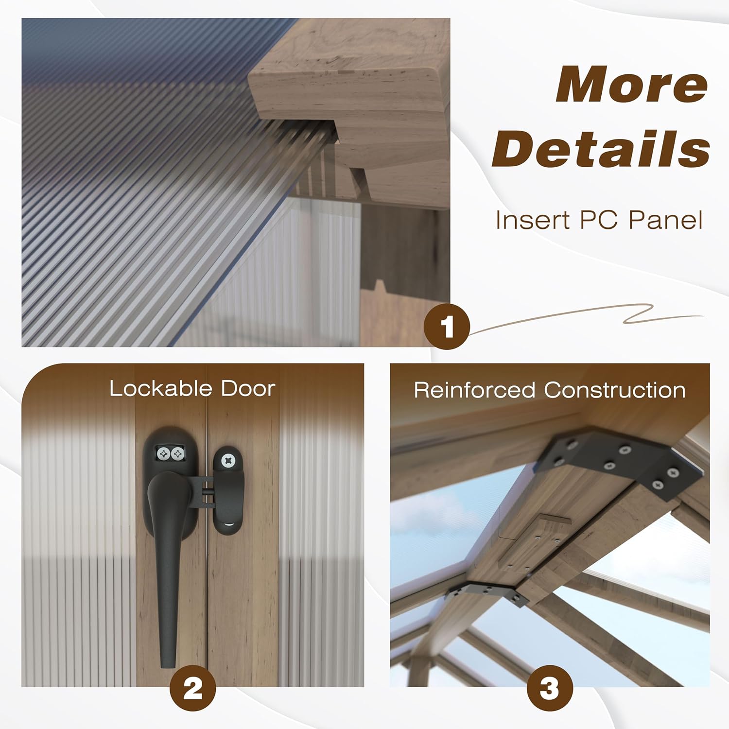 - Lockable Door & Walk-in Space: This walk-in greenhouse has a front door that you can easily enter and lock when you leave without worrying about losing items. Add some furniture to turn your wooden greenhouse into a vibrant party room.