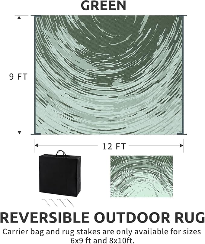 - RV traval&Camping: This camper must haves outdoor rug is ideal for picnics, gatherings, and RV trips! The lightweight outdoor camping carpet with foldable lines is easy to carry and saves space. Includes an extra carry bag and rug stakes for 6x9 ft, 8x10 ft and 9x12 ft. Grass-friendly, durable, and easy to clean, this outdoor rug enhances outdoor adventures.