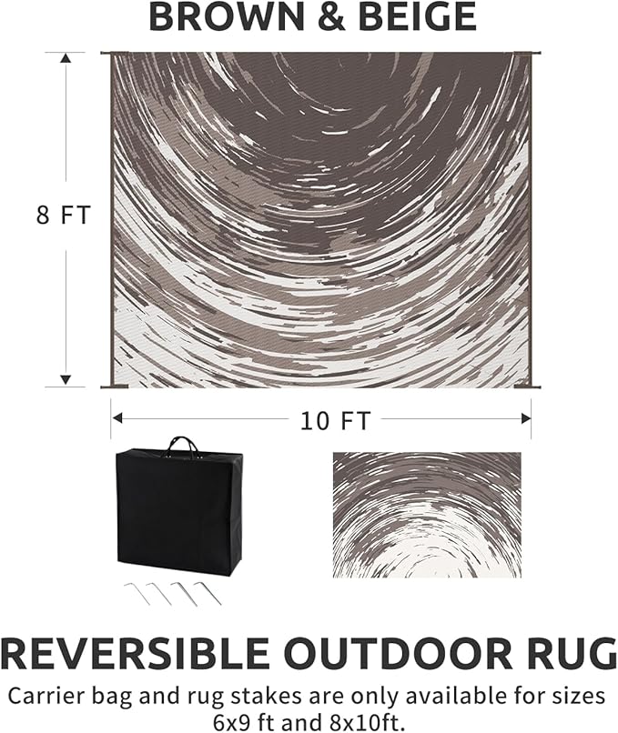 • RV traval&Camping: This camper must haves outdoor rug is ideal for picnics, gatherings, and RV trips! The lightweight outdoor camping carpet with foldable lines is easy to carry and saves space. Includes an extra carry bag and rug stakes for 6x9 ft, 8x10 ft and 9x12 ft. Grass-friendly, durable, and easy to clean, this outdoor rug enhances outdoor adventures.