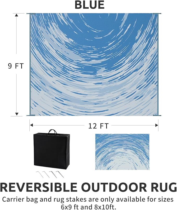 - RV traval&Camping: This camper must haves outdoor rug is ideal for picnics, gatherings, and RV trips! The lightweight outdoor camping carpet with foldable lines is easy to carry and saves space. Includes an extra carry bag and rug stakes for 6x9 ft, 8x10 ft and 9x12 ft. Grass-friendly, durable, and easy to clean, this outdoor rug enhances outdoor adventures.