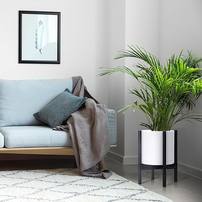 - A Complete Set: Minimalist plastic planter, combined with a sculptural, solid wood stand that match perfectly together and looks great in any home.