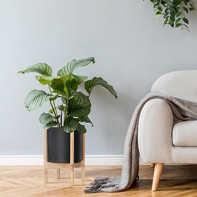- A Complete Set: Minimalist plastic planter, combined with a sculptural, solid wood stand that match perfectly together and looks great in any home.