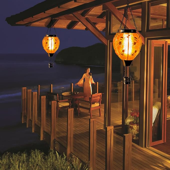 - 【Hanging Solar Light with Flickering Flame】The glass hot air balloon solar lantern with metal "S" hooks can be easily hung anywhere, such as balconies, porches, ledges or trees. The bright hot air balloon decorations during the day can add color to your outdoor space, and at night to add a warm and romantic atmosphere to your homeland.