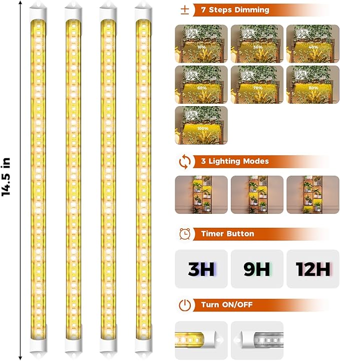 • Plant Shelf with Grow Light: The plant light contains 3 supplemental light modes: 1. 48 leds warm white(3000k), only 3000k high uniform light ,like sunlight improve seeding growth ; 2. 48 leds Red (660nm): promote plant growth , flowering and fruit; 3. Red+ Warm White (380nm-780nm), Provide universal full spectrum which can meet the light conditions your plants need most in different stages.