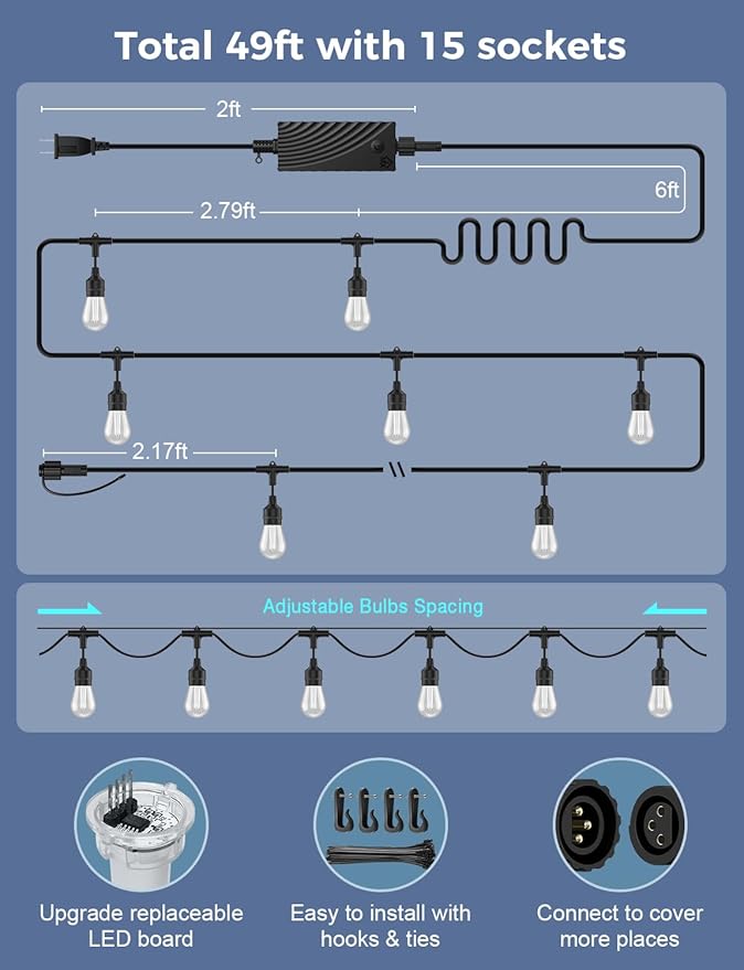- Hassle-free Group Control: Manage multiple sets of led patio string lights as a single unit to sync the same series of lights across locations with one touch; and you can also easily control the same set of string lights with your family or friends