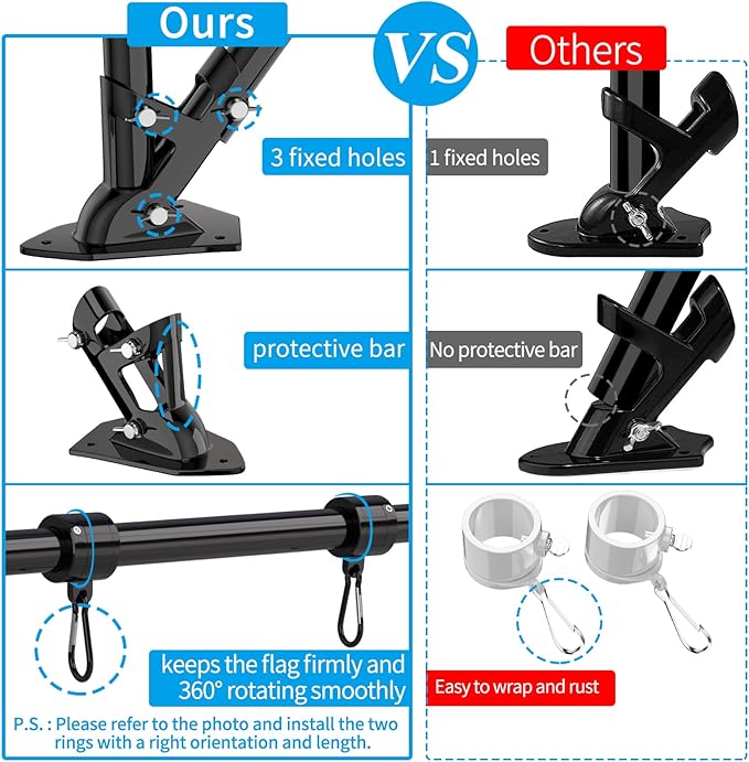 - Upgraded Bracket and Tangle Free Rings: The high strength aluminum alloy flag pole holder has unique protective bar and 3 fixed holes to make the two-position (90ยฐ and 45ยฐ) flag pole more stable. The two new designed flag rings and two sturdy carabiners, which could make the flag tangle-free in the wind. And Adjustable length swivel flag pole kit can be installed according to the different size flags.
