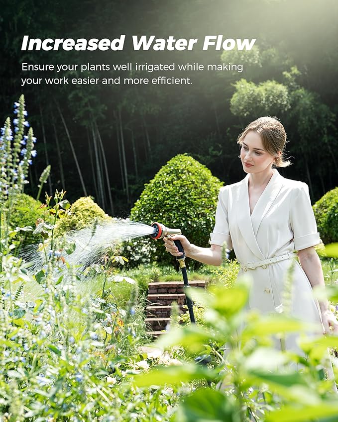 - Full Metal Nozzle: Made of high-quality zinc alloy, this heavy-duty hose nozzle resists leaks, rust, corrosion, and wear. With nine adjustable watering patterns and an ergonomic, non-slip rubber grip, it provides a smoother watering experience