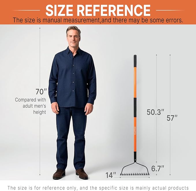 Garden Rake Heavy Duty with Orange Fiberglass Handle - 14-Tooth Metal Yard Hard Rake for Gardening, Farming, and Yard Work ,57 Inch