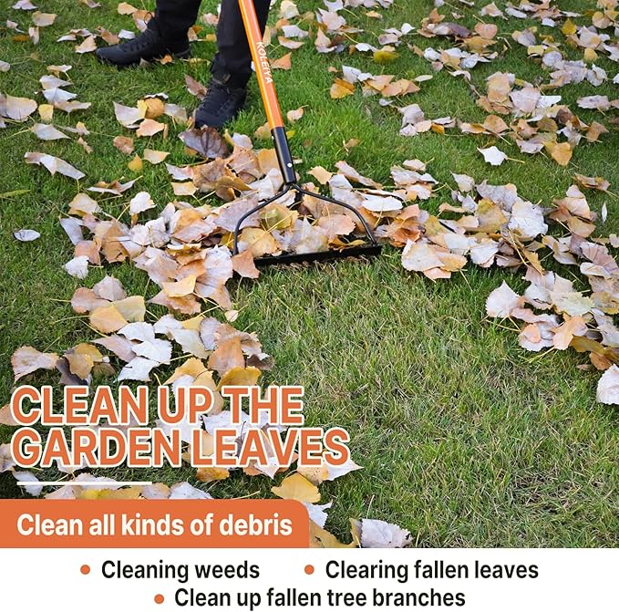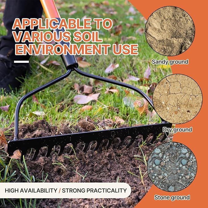 - Multi purpose:garden rake good for leveling/packing soil and raking leaves especially in between plants.Equally suitable for distributed newly laid topsoil,moving soil or mulch.