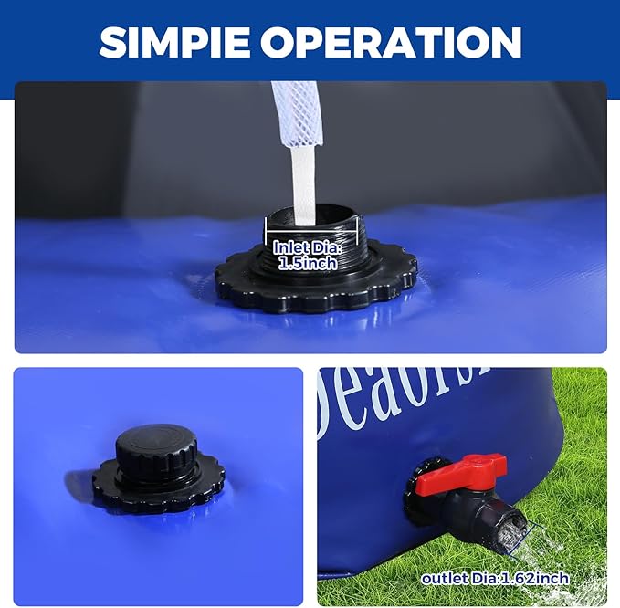 - 【Multiple uses】Collapsible Water tank is non flammable,resistance to climate change,widely used in RV and camping,gardening watering, farm, outdoor, emergency water storage, agricultural irrigation, transport of water sources, etc.The Portable Large Capacity Water Storage comes with two sizes of pipe, the 0.9-inch pipe is mostly used in kitchens and bathrooms, it's suitable for RV and camping.The 1.3-inch pipe is mostly used Iin outdoors, it's suitable for gardening watering and farm irrigation ,etc.