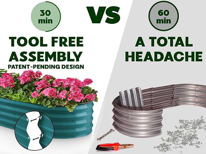 - EFFORTLESS ASSEMBLY, LIKE NO OTHER! Begin your planting journey by choosing our innovative patented design, featuring the perfect combination of easy assembly and durability. Thanks to our unique tool-free design, assembly is a breeze and can be completed in just 30 minutes! Get started on your garden right away and enjoy fresh, healthy produce in no time.