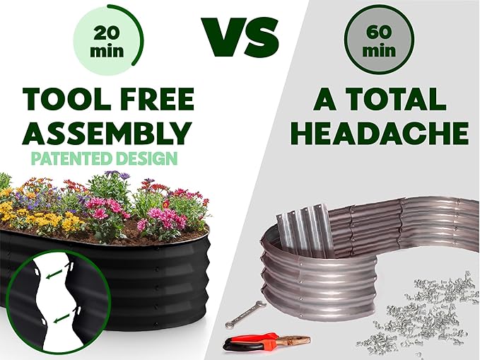 - EFFORTLESS ASSEMBLY, LIKE NO OTHER! Begin your planting journey by choosing our innovative patent-pending design, featuring the perfect combination of easy assembly and durability. Thanks to our unique tool-free design, assembly is a breeze and can be completed in just 20 minutes! Get started on your garden right away and enjoy fresh, healthy produce in no time.