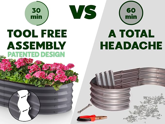 - EFFORTLESS ASSEMBLY, LIKE NO OTHER! Begin your planting journey by choosing our innovative patented design, featuring the perfect combination of easy assembly and durability. Thanks to our unique tool-free design, assembly is a breeze and can be completed in just 30 minutes! Get started on your garden right away and enjoy fresh, healthy produce in no time.
